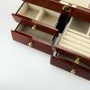 This attractive wood jewelry storage box showcases a delicate stylish appeal that every jewelry collector dreams for! TG503DBC is designed with spacious storage compartments to accommodate all kinds of rings, earrings, bracelets, necklaces and other personal belongings. The handcraft dark burlwood high polished lacquer and soft camel-brown velvet lining provides a vintage and luxury look.